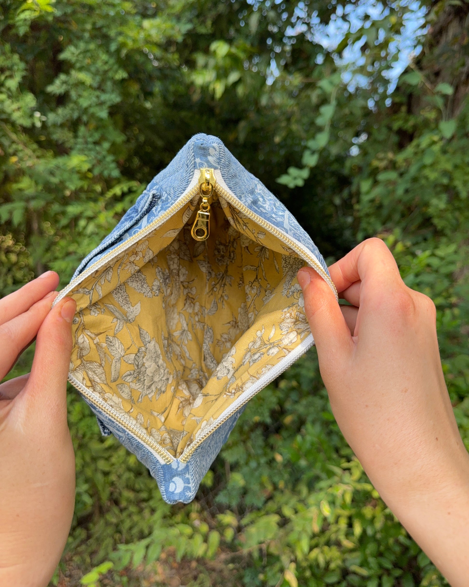 This upcycled patchwork pouch is handmade from thrifted denim in a variety of washes, creating a bold, one-of-a-kind accessory full of character and charm. Designed for everyday use, it’s both stylish and practical — perfect for holding makeup, pens, or small essentials on the go.