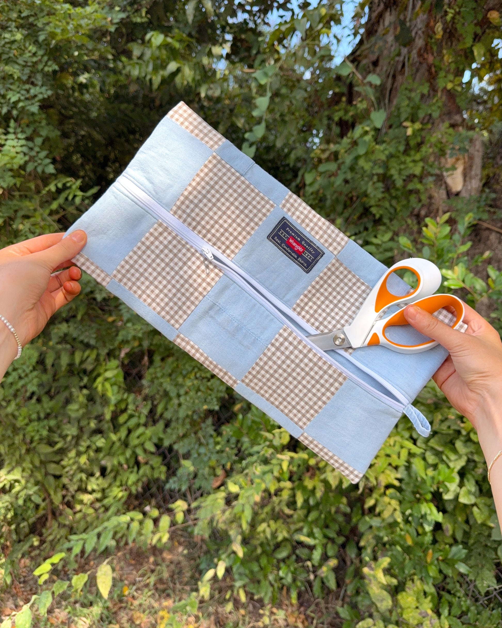 This upcycled flat zipper pouch started its life as a Wrangler denim shirt — now reimagined into a one-of-a-kind bag, perfect for everyday use.